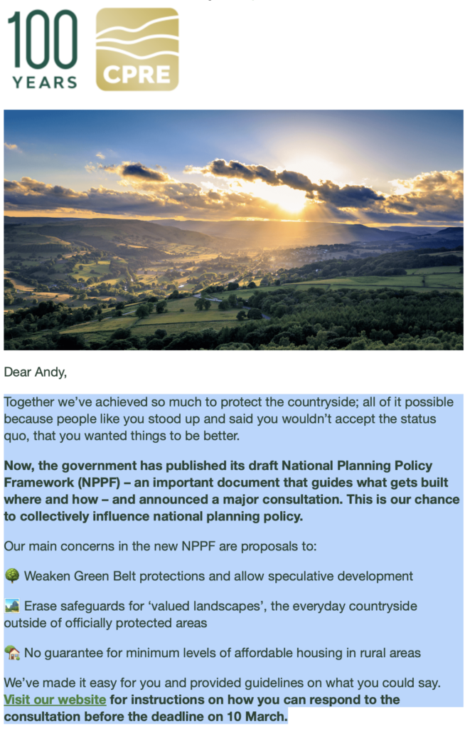 Thankyou to Council for the Protection of Rural England (CPRE) for sending us a link to the NPPF consultation and for attending and speaking at the Gladman Develpoment Appeal Inquiry (see box above).